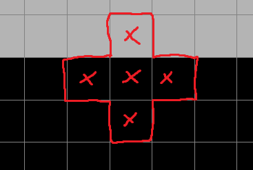 A kernel describes a certain shape for sampling around the current pixel when running a pixel shader. Usually, this is a square with specified dimensions. For example, a simple box blur uses a 3x3 kernel to sample the 9 pixels surrounding a pixel and average them to achieve a blurring effect. In our case, we use a 3x3 plus-shaped kernel because Units can only move up, down, left and right, not diagonally.